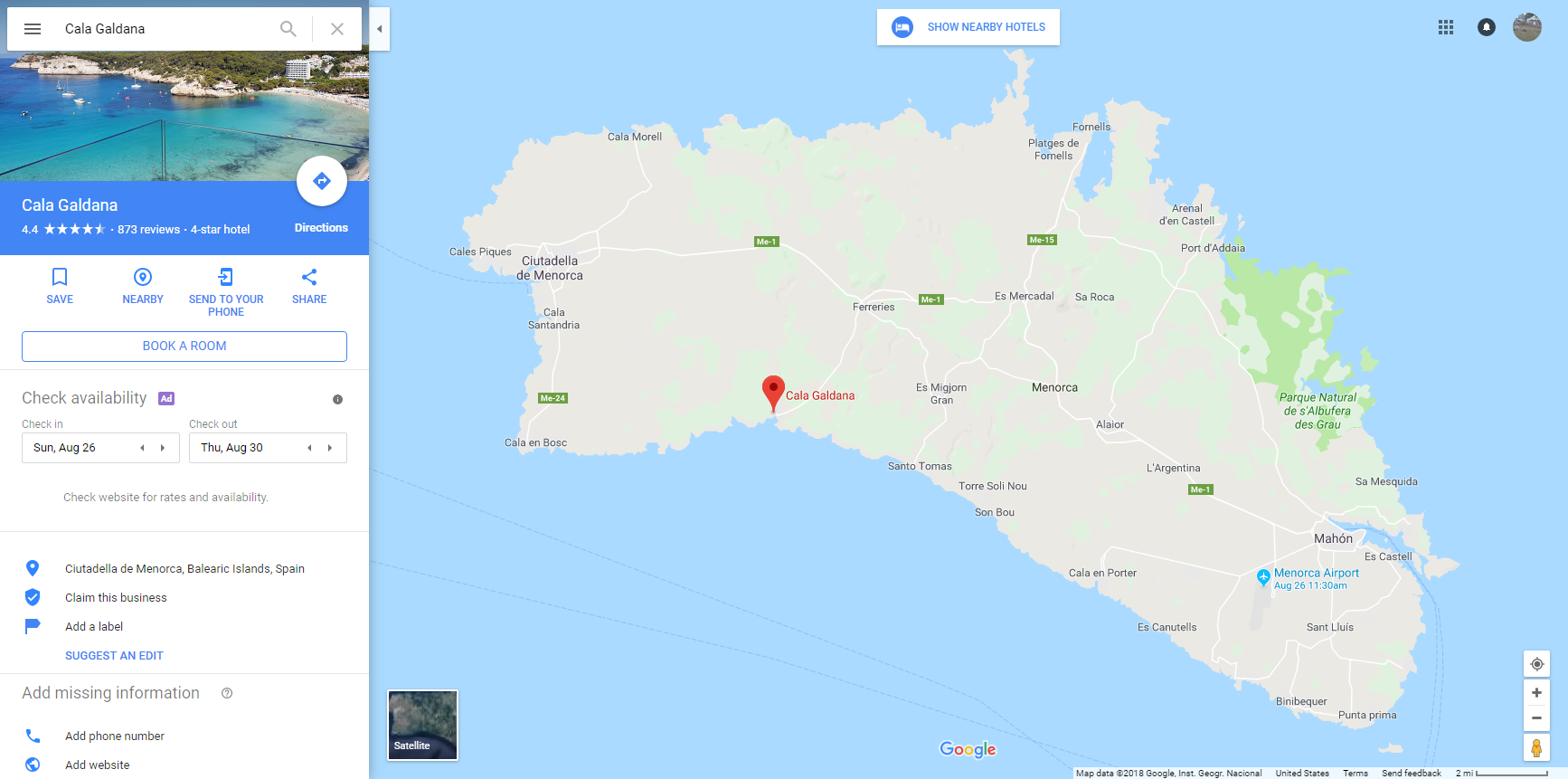 We can rent bikes or kayaks from them. We can book spas or massages. There are a couple more remote beaches west - Cala Macarella and Cala De La Macarelleta - and to the east - Cala Mitjana. From what I can tell we could walk or bike to these along those trails. Might take 30 minutes to walk, but from what I can tell, the parking lots for these beaches are 15 minutes away from the beach, so you'd have to walk to get there anyway.